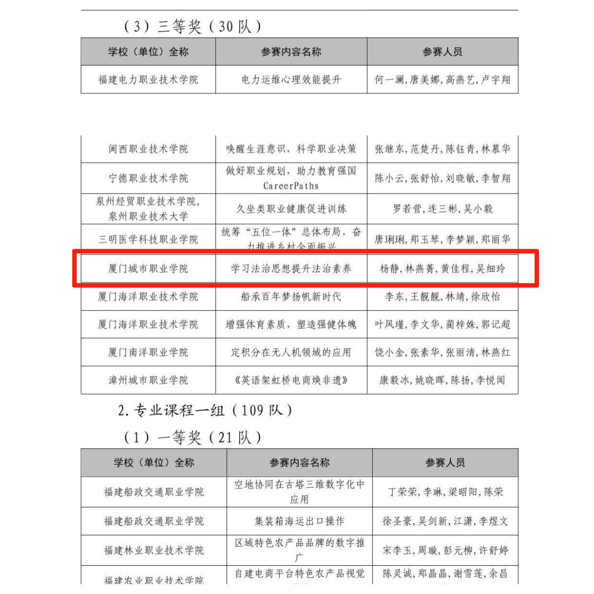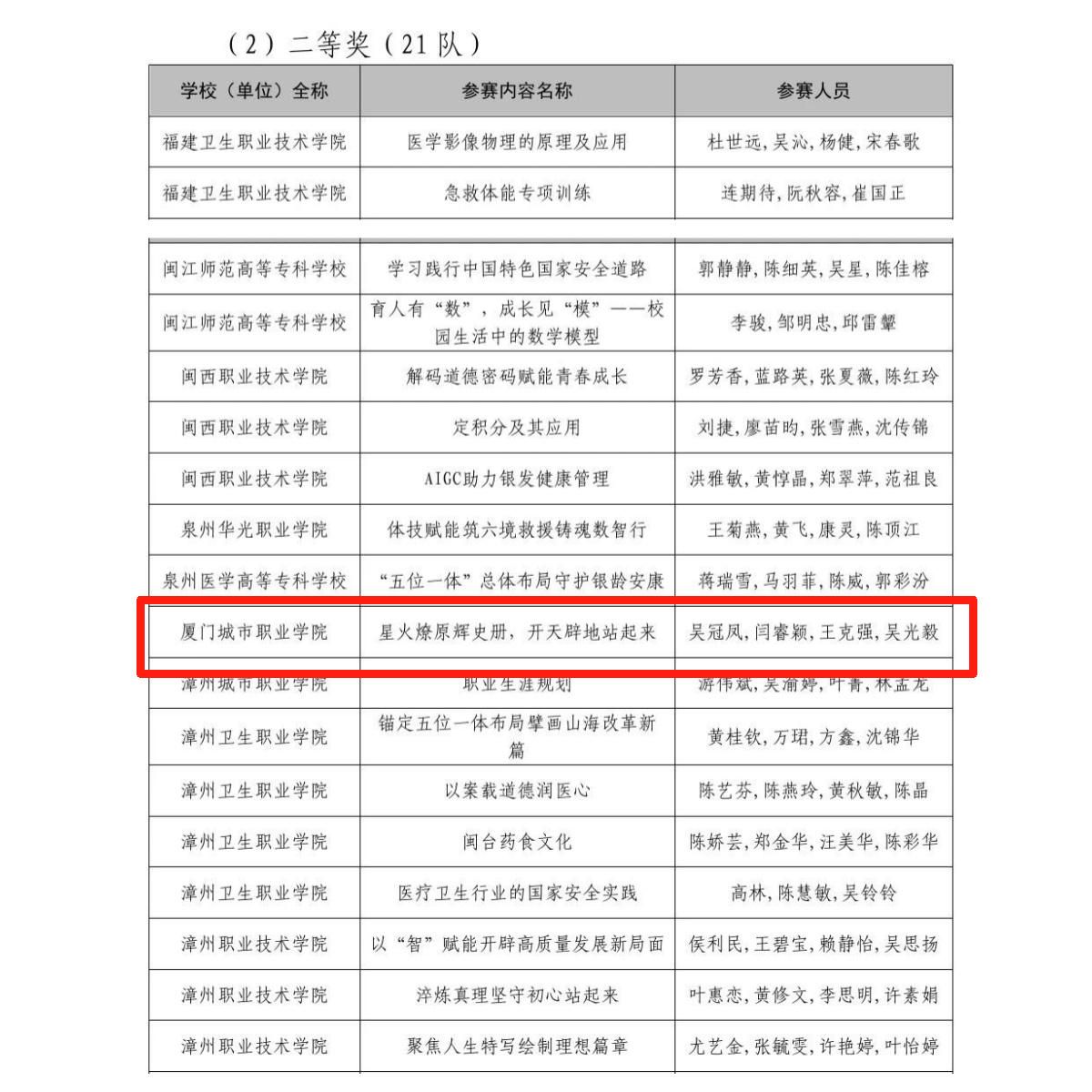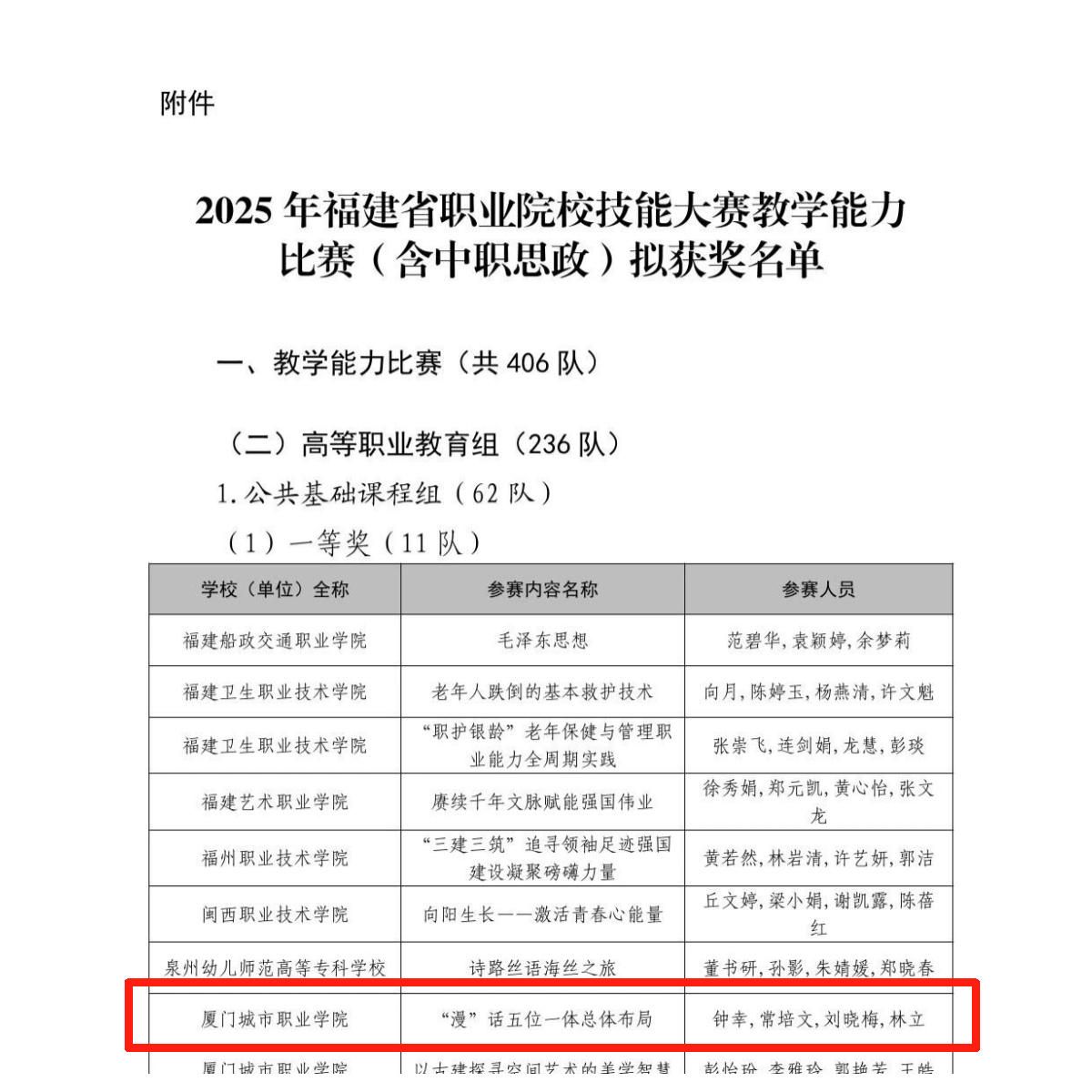 近日,由福建省教育厅主办的2025年福建省职业院校技能大赛教学能力比赛(含中职思政)圆满落幕。马克思主义学院3组参赛团队凭借扎实的专业知识、创新的方式方法、娴熟的信息化技术,在众多参赛团队中脱颖而出,荣获一二三等奖各1项。