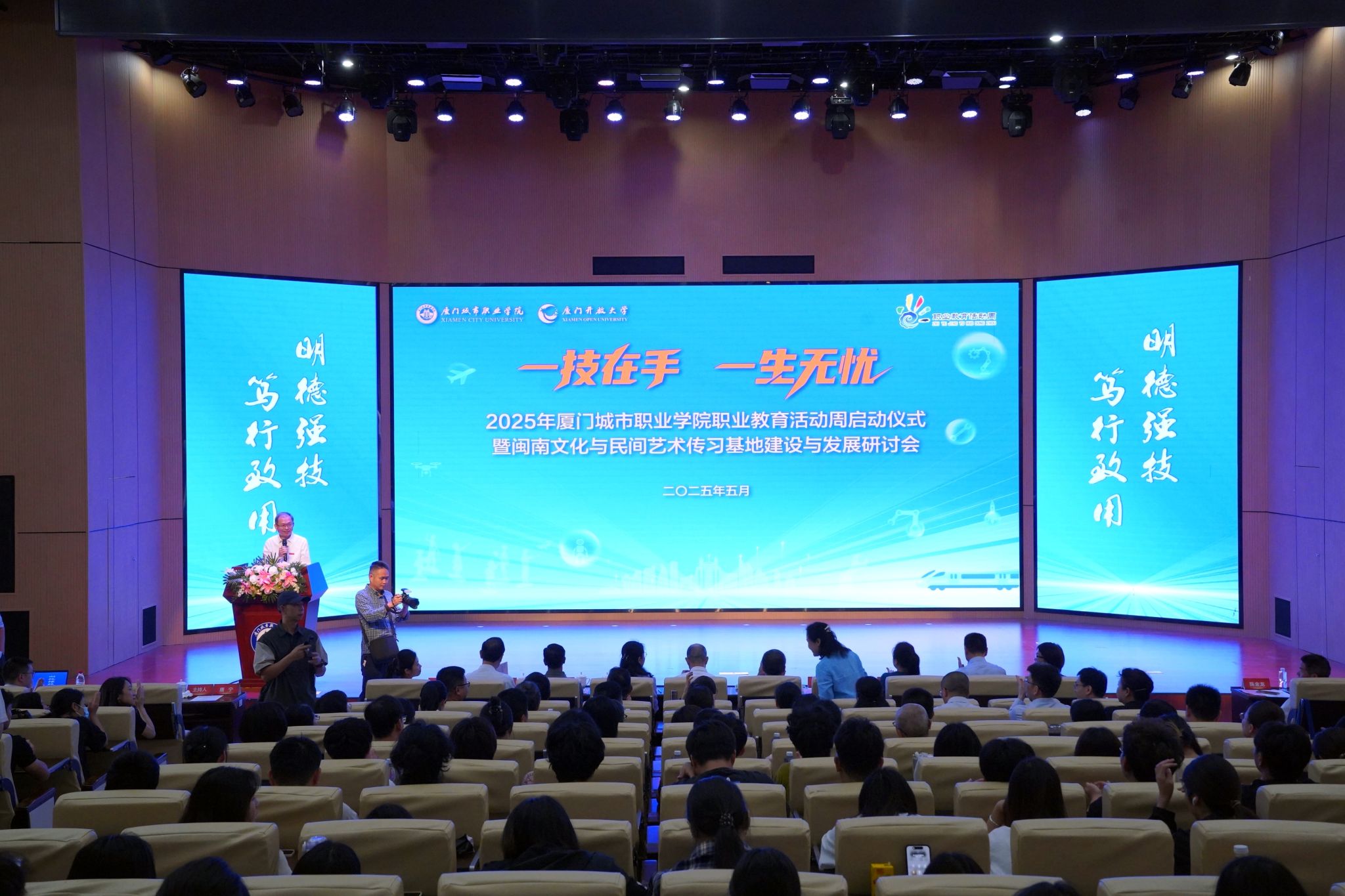 5月15日上午,我校在南校区报告厅举办2025年职业教育活动周启动仪式暨闽南文化与民间艺术传习基地建设与发展研讨会。校领导、前埔片区大中小幼思政课一体化建设联盟校领导、合作企业单位代表、闽台专家及非遗传承人等出席活动,校内各单位负责人和师生代表参加。启动仪式由校长唐宁主持。