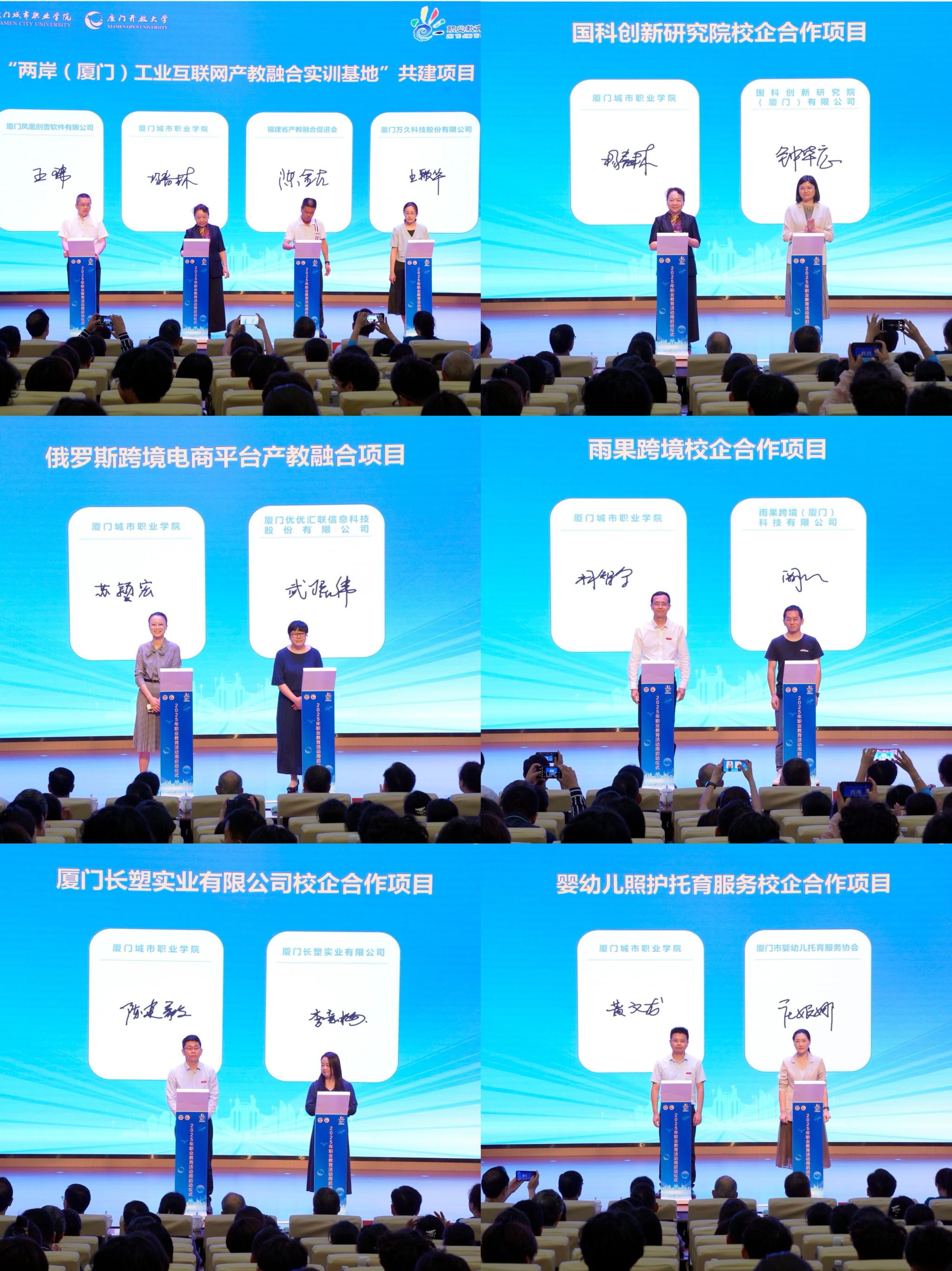 学校与厦门凤凰创壹软件有限公司、厦门万久科技股份有限公司、厦门优优汇联信息科技股份有限公司、厦门长塑实业有限公司、雨果(跨境)科技有限公司、国科创新研究院(厦门)有限公司、厦门市婴幼儿托育服务协会、福建省产教融合促进会等8家单位分别签订了“两岸(厦门)工业互联网产教融合实训基地”共建项目等6项合作协议。