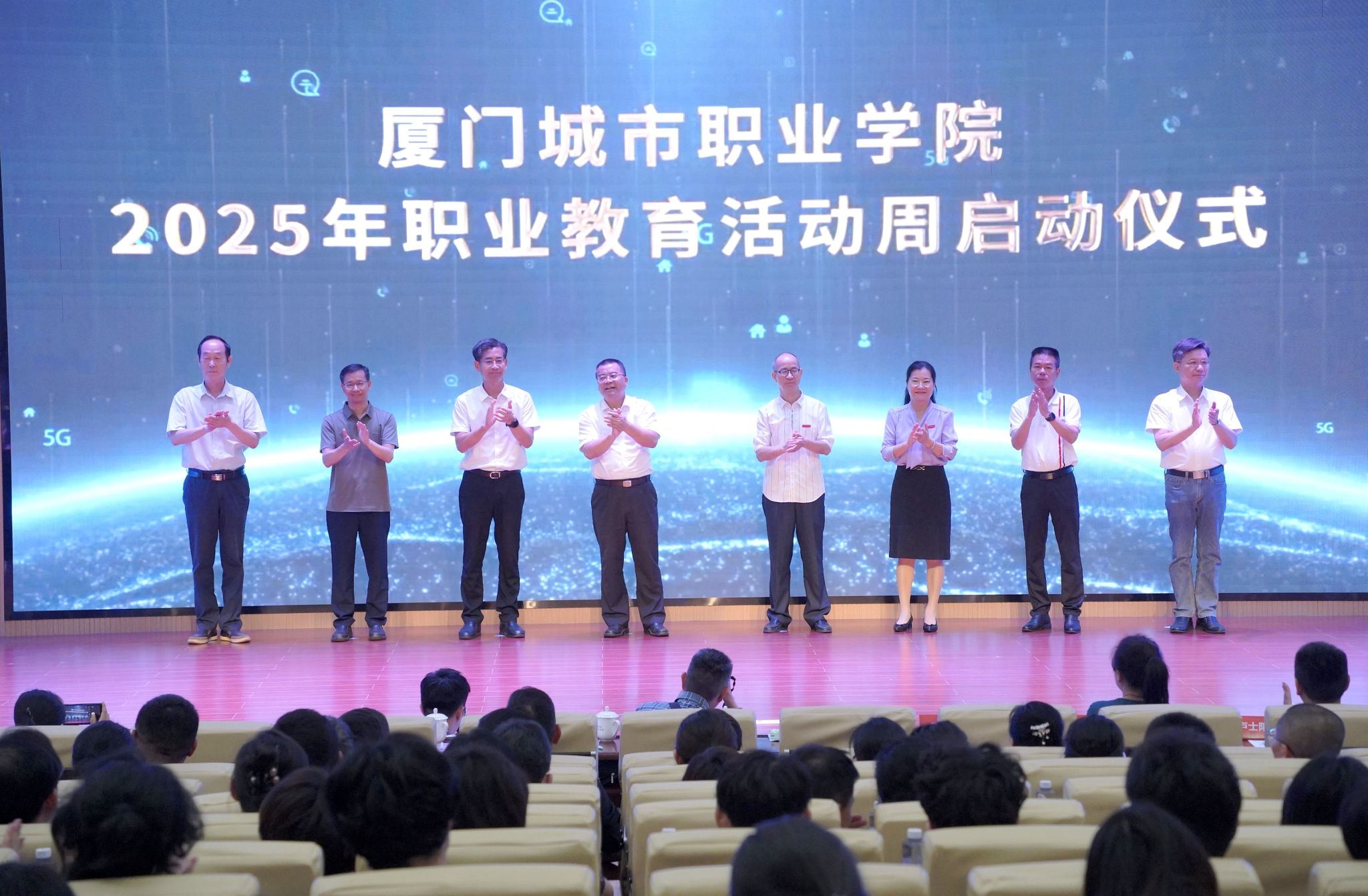校领导和厦门市大同中学副校长池毓发,福建省产教融合促进会副秘书长陈金龙,厦门市婴幼儿托育服务协会会长张明河,国科创新研究院(厦门)有限公司院长李岳龙共同按下启动键,正式开启厦门城市职业学院2025年职业教育活动周。
